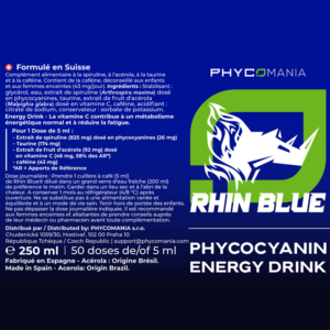 Eau, extrait de spiruline (Arthrospira maxima) dosé en phycocyanines (10 000 mg/L), glycérol (stabilisant), acide citrique (acidifiant), sorbate de potassium (conservateur).